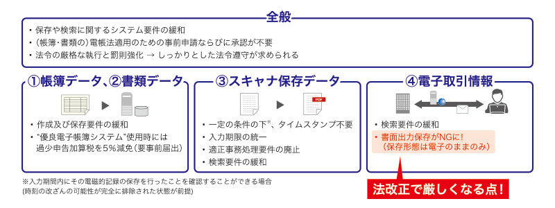 また書類をデータ化する入力の期限も統一されます。書類の入力時に義務付けられていた相互けん制や定期検査の体制(適正事務処理要件)も法的要件ではなくなりました。これによって、一人の担当者が書類をデータ化し、破棄できるようになりました。