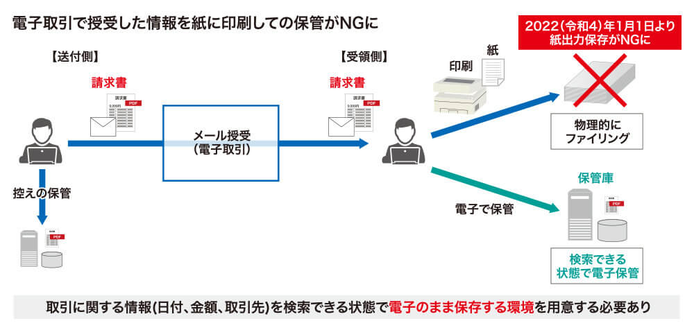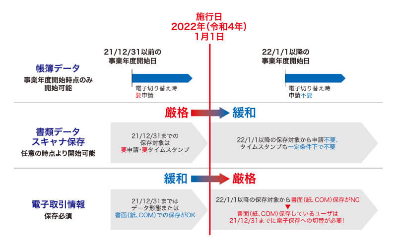 電子取引情報については、現時点で電子データや紙、COMへの書面出力のいずれかで保存する義務がありますが、書面出力して保存している企業についてはこの日までに改正電帳法に準じた電子データでの保存運用に切り替えなければなりません。