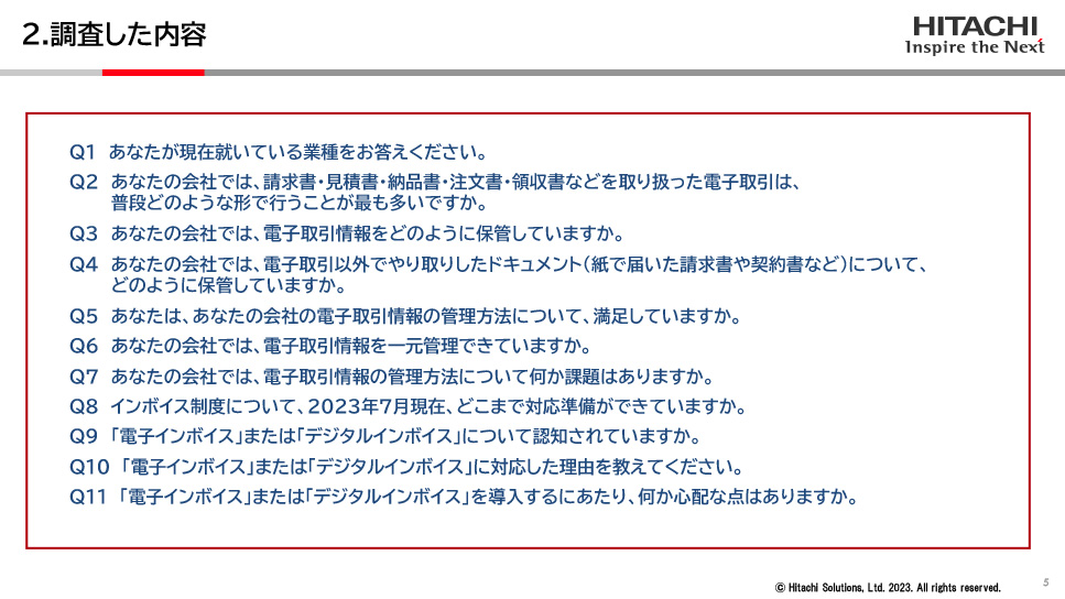 大企業(従業員501人以上)の調達・購買部門、経理・財務部門、システム企画部門、情報システム部門に所属する会社員・団体職員・経営者・役員 100名を対象に、「電子取引情報の保管方法」「電子取引情報の管理方法についての課題」「2023年7月までのインボイス制度の対応準備の有無」「「電子インボイス」または「デジタルインボイス」に対応した理由」「「電子インボイス」または「デジタルインボイス」を導入するにあたり、心配な点」などを聞きました。