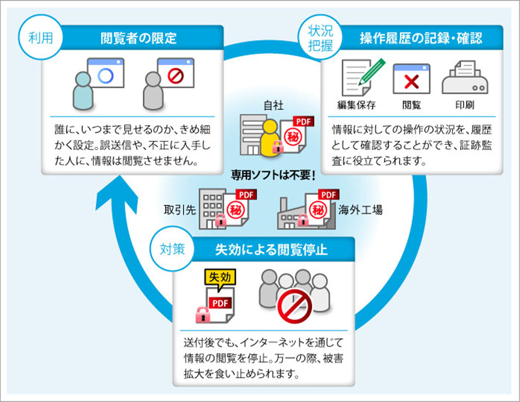 「誰に対して」「どのような操作を」「(いつまで)許可するのか」といったセキュリティポリシーを文書ごとに設定できるので、企業の文書運用規定に則った運用が可能です。また「誰が」「いつ」「どのような操作を」行ったか、履歴として記録します。文書管理システムやメールシステム、イントラネットなどと連携することで、利用者の負担も軽減します。