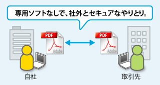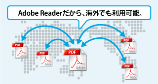 国際標準規格であるPDFを採用しており、閲覧に必要なソフトは無償のAdobe Readerのみ。特別な閲覧ソフトの配布およびインストールといった事前準備が不要で、取引先に負担をかけません。特に暗号プログラムを海外へ配布するには輸出手続きが必要となりますが、Adobe Readerなら世界中でダウンロードできるため、そうした手間も不要です。