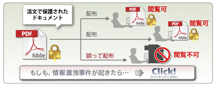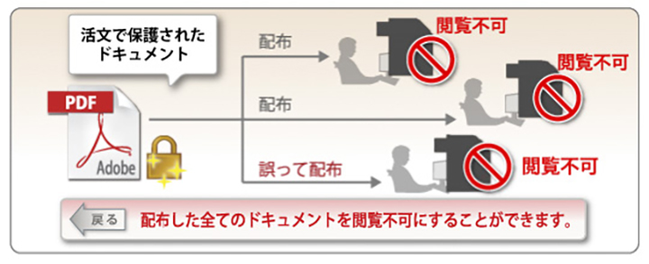 「活文 Document Rights Manager」なら、閲覧権を情報ごとに社内外で設定でき、一度共有した情報を、後から閲覧不可にすることが可能。