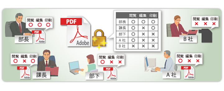 社外に拡散した文書の利用停止を実現するIRM(Information Rights Management)技術に、多くの導入実績を誇り、信頼性も高いAdobe Experience Manager Forms※を採用しています。