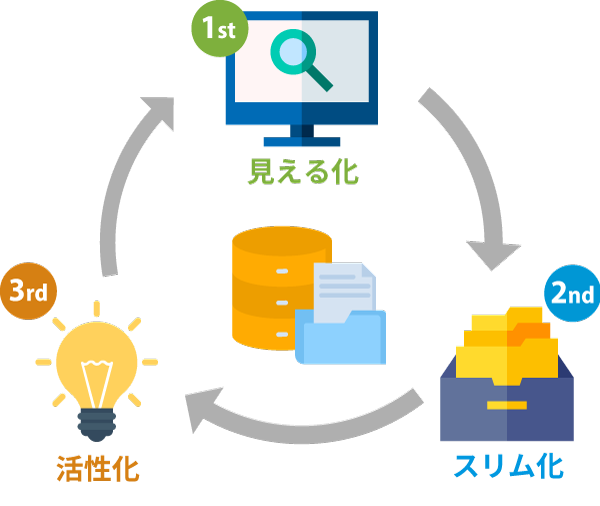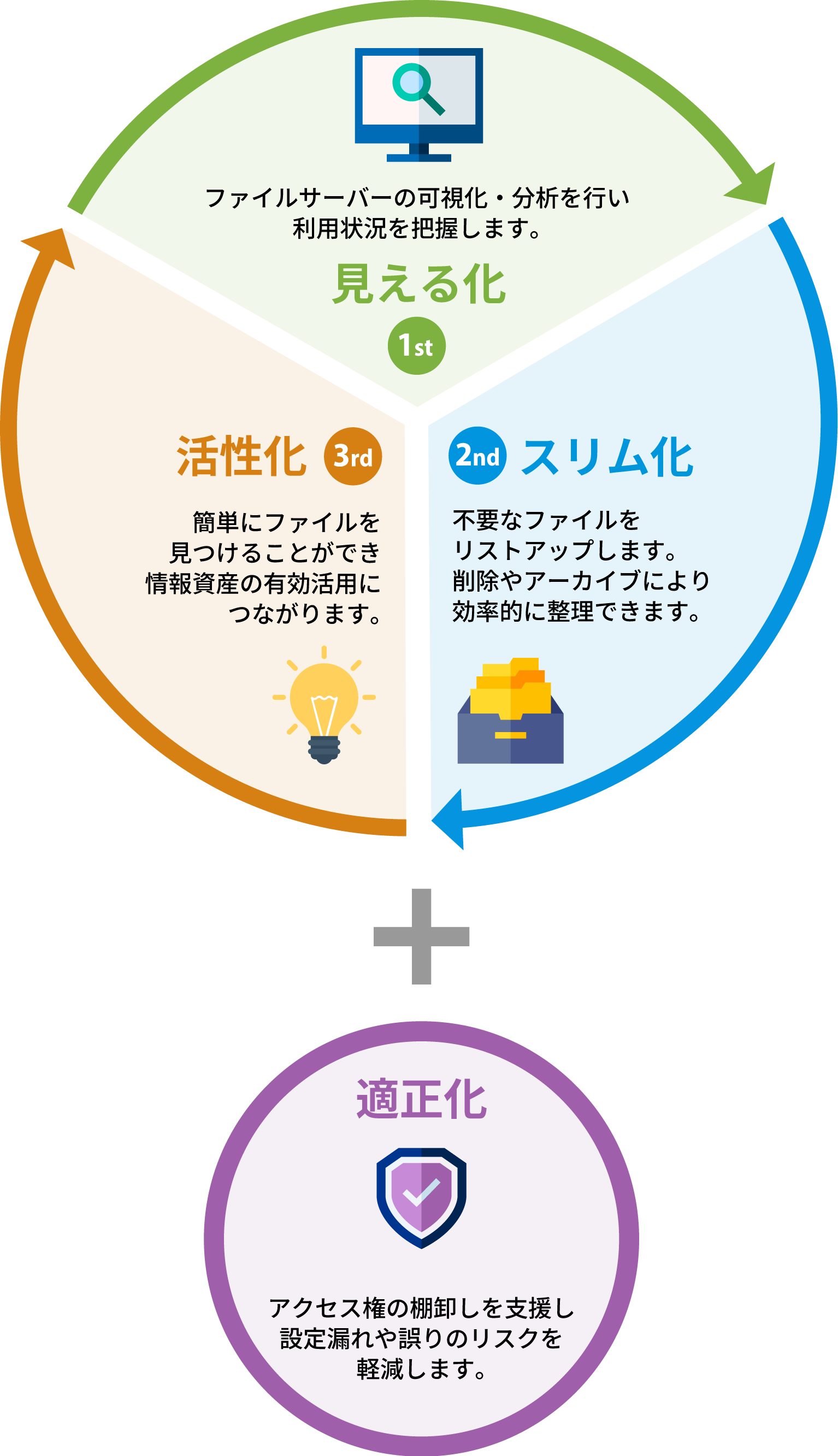 ファイルサーバーの状況をわかりやすく「見える化」し、不要ファイルを「スリム化」して空き容量を創出。ファイルが見つけやすくなる仕組みで利用を「活性化」し、情報資産の有効活用を促進。