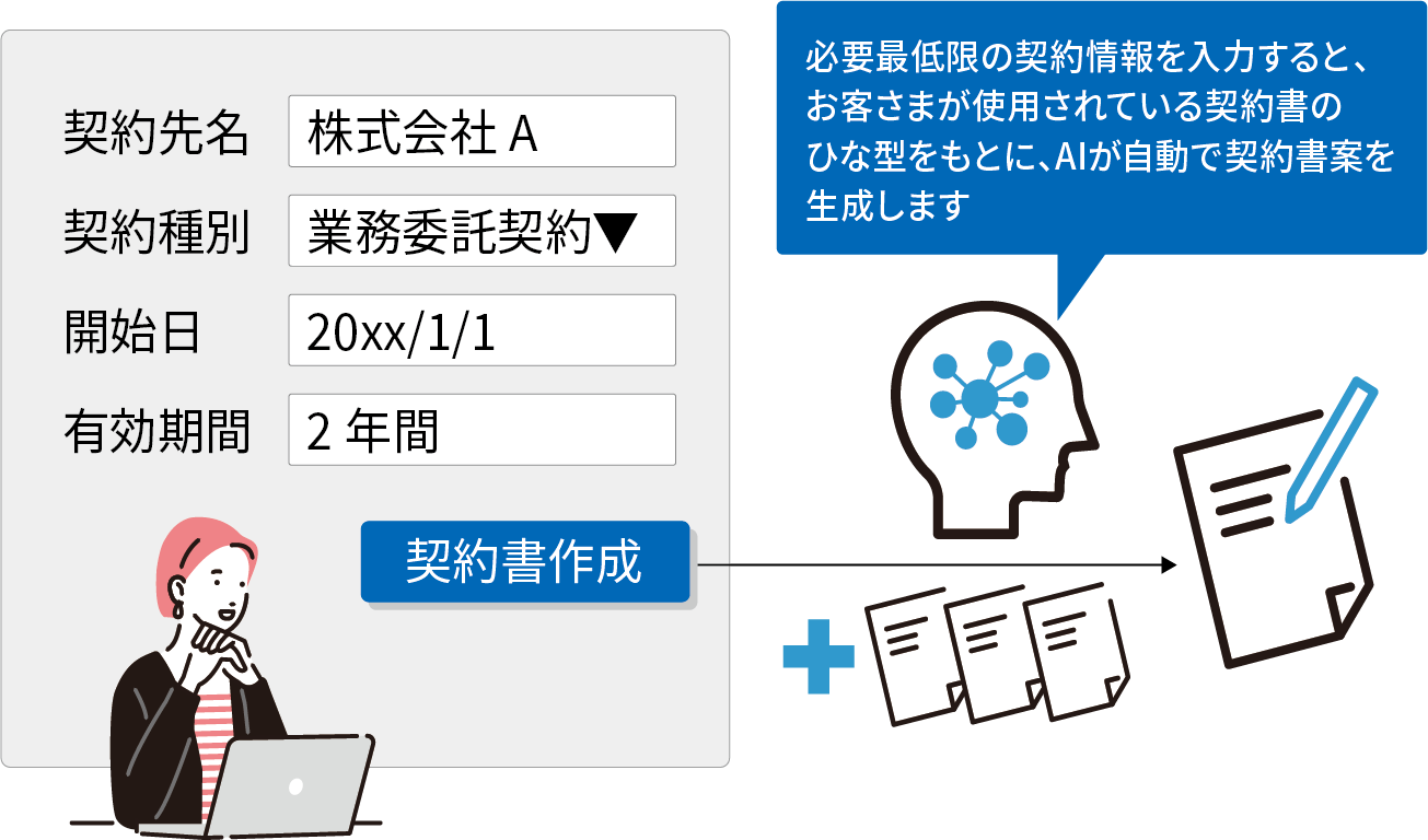 契約情報とお客さまの契約書のひな型から、契約書案を作成します。