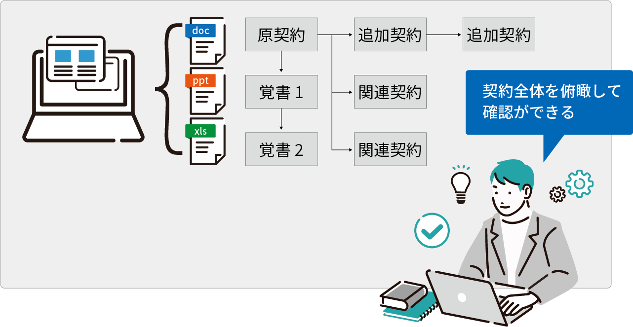 原契約と覚書など、契約間の関連性も管理できるので、契約をまたいで経緯を確認することができます。