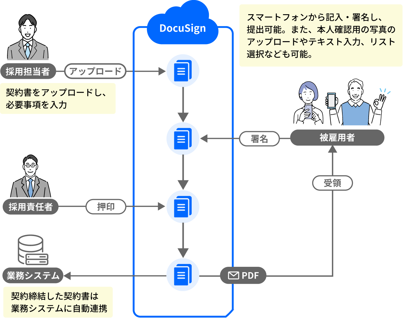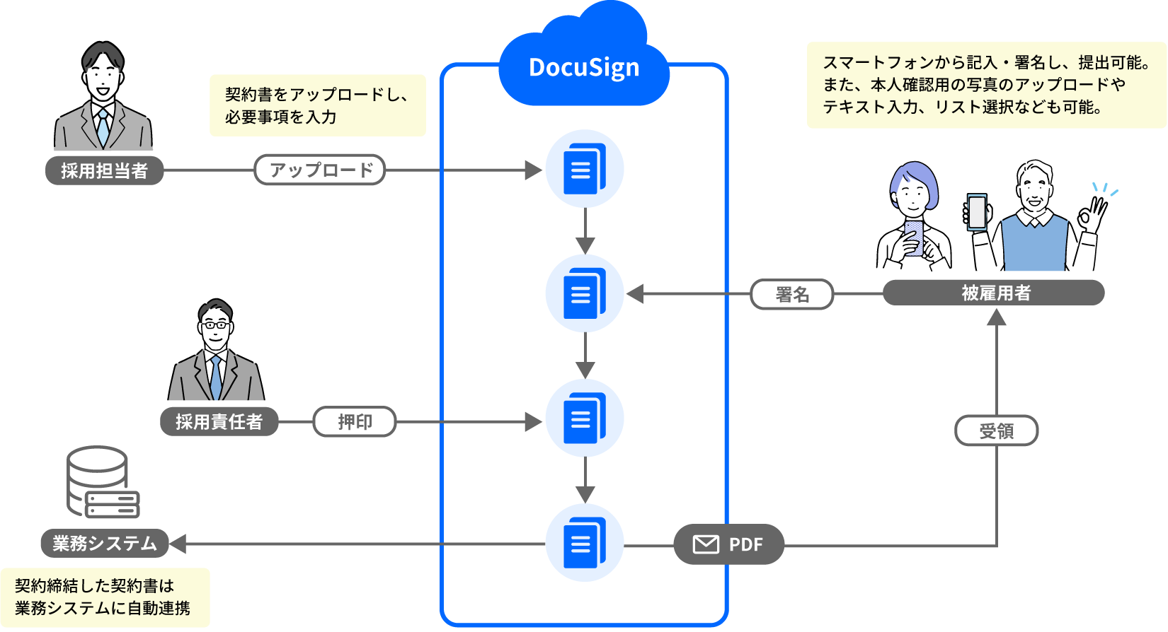 既存の雇用契約の流れを変えず、社内システムと連携して署名部分だけを電子化するなど、