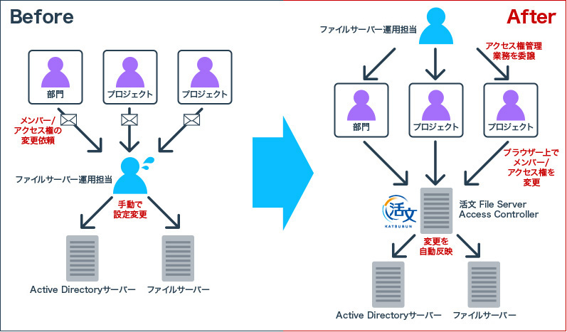 セキュリティグループの新規作成やアクセス権変更などを現場ユーザーが社内申請し、情報システム部門のファイルサーバー運用担当が設定・変更するという運用では、申請から設定完了までにどうしても時間がかかってしまいます。