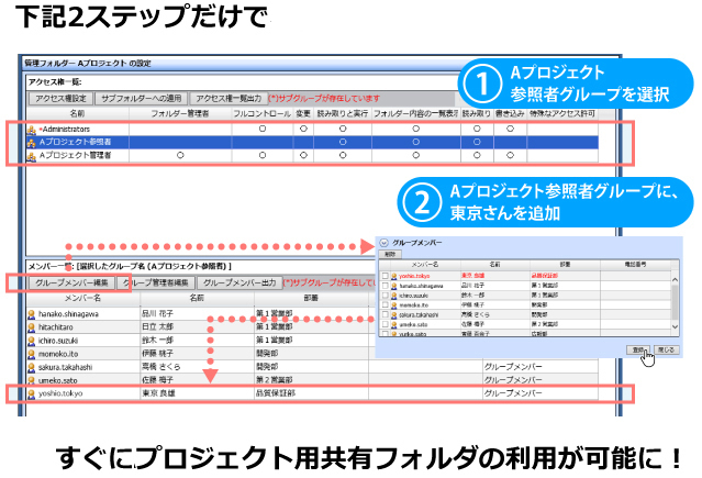 自部署の共有フォルダにアクセスできるメンバーやアクセス権の詳細を、情報システム部門に頼らず現場ユーザーがWeb画面で確認したりCSV出力したりできます。