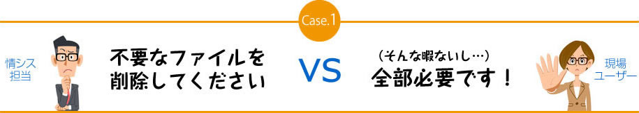現場ユーザーにとって、情報システム部門からの不要ファイル削除依頼は業務の妨げでしかありません。忙しくて確認する時間もないし、少しだけ減らしてあとはすべて移行してもらおう…という人が多ければ大きなスリム化は期待できず、リプレースコストが膨らんでしまいます。かといって、情報システム部門でファイルの要不要を判断することは困難で、ファイルサーバーのスリム化には現場ユーザーの参加が不可欠です。