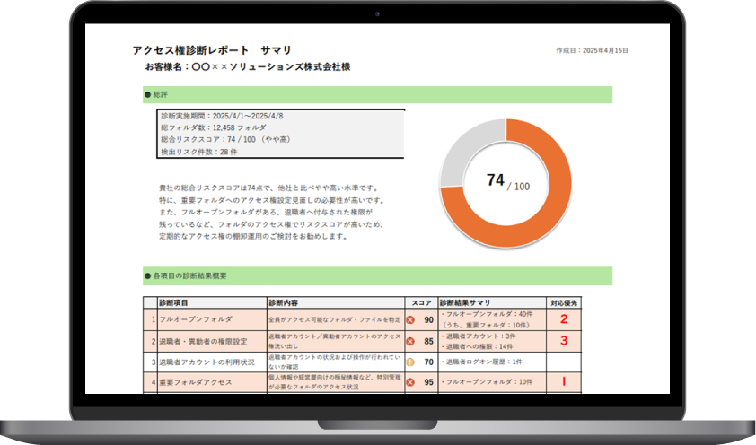 お客さまのファイルサーバーやActive Directoryの情報をもとに、アクセス権の状態を診断。見えづらかったリスクを「可視化」し、情報漏洩や内部不正などのトラブルを未然に防ぐ第一歩をサポートします。(本アセスメントは有償でのご提供となります)