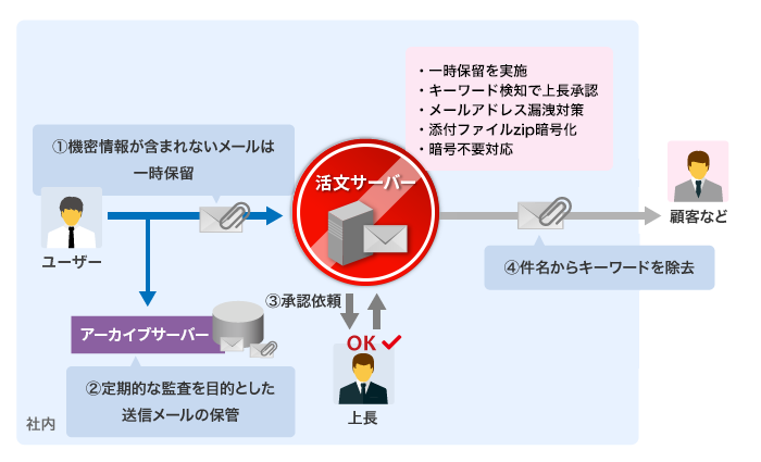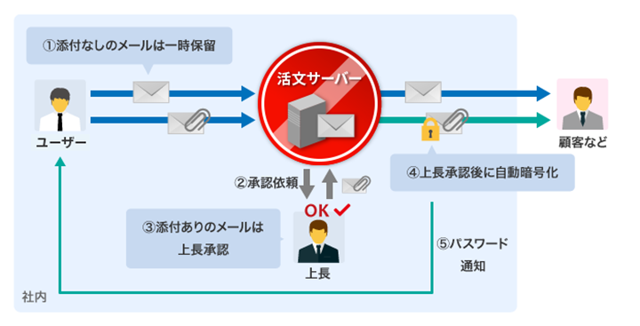 - 送信メールの添付ファイルは、上長の承認後に自動暗号化して、外部に送信される。
