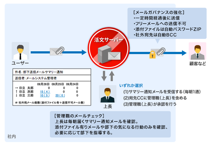 - 活文 メールゲートウェイサーバーとの連携により、ZIP暗号化のニーズにも対応できる。