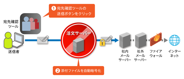 - 添付ファイルは 活文 メールゲートウェイ の保留解除後に自動暗号化。