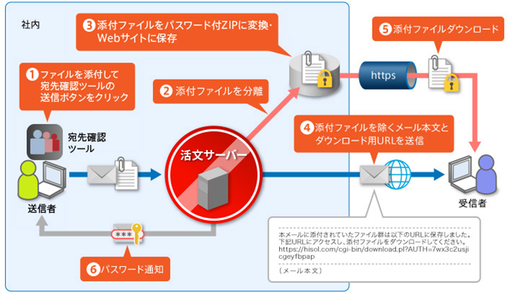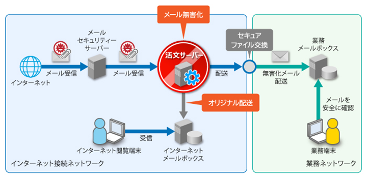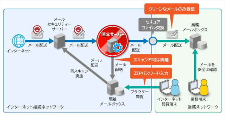 ZIPなど暗号化ファイルが添付されたメールは、活文サーバーが一時保存。受信者がWebブラウザーからパスワードを入力して暗号化を解除し、メールセキュリティサーバーがチェックした後に業務ネットワークへ配信します。