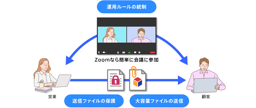 会議開催者以外は有償ライセンス不要かつ簡単操作で参加できるZoomは、オンライン営業に適しています。Zoomのセキュリティ設定に詳しくなくても、運用ルールに則った会議を開催することができますし、お客さまの重要資料も閲覧者を限定でき、情報流出対策も可能です。大容量ファイルも送信可能ですから、会議推進もスムーズです。