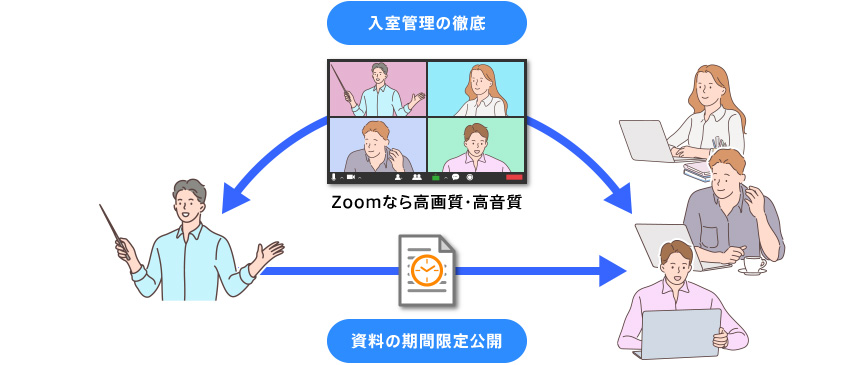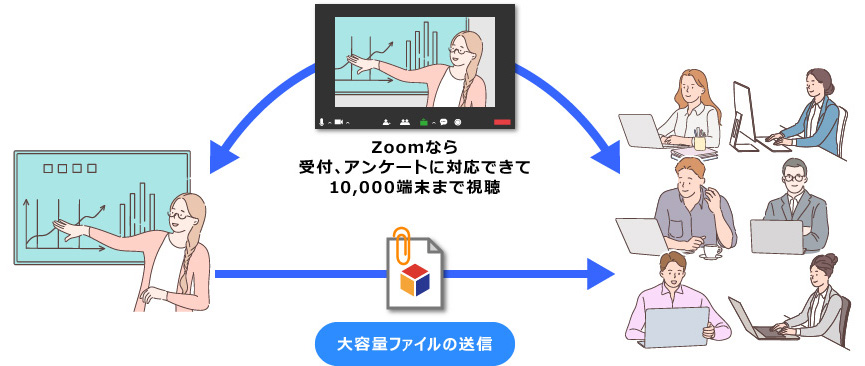 簡単操作で参加でき、受付機能やアンケート機能も整ったZoomならオンラインセミナーを容易に開催することができます。また、配布資料が大きなサイズとなる場合、大容量ファイルの高速送信が可能ですから、事前の準備も効率的に行うことができます。