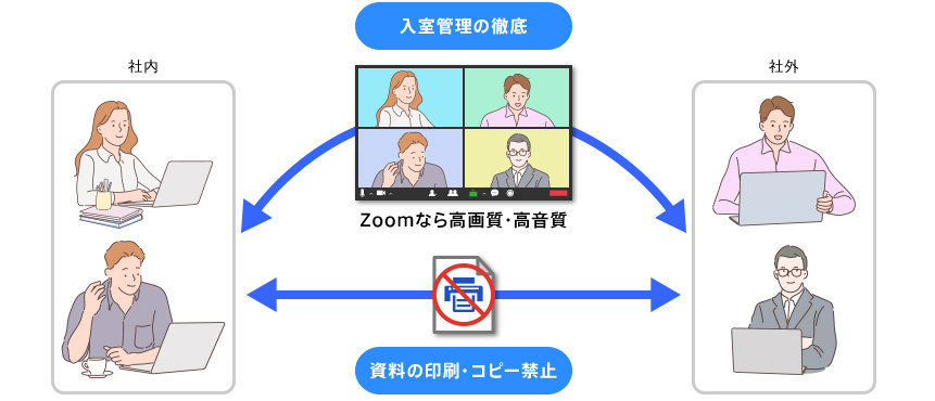 パートナー企業との重要な合意形成を行うプロジェクト会議には、高画質、高音質なZoomが適しています。オンライン会議の入室パスワードや待機室の設定忘れも防止でき、会議資料も印刷やコピーを禁止としメンバーしか閲覧できないようにできるなど、さまざまなセキュリティ対策を講じることができます。