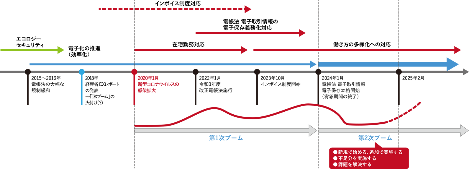 「この流れを振り返ると、ペーパーレス化には大きく2つの波があったと言えます」と言うのは石田。第1次ブームは新型コロナウイルスの感染拡大を背景にしたペーパーレス化、第2次ブームは2024年から始まった電帳法対応のためのペーパーレス化だと指摘します。