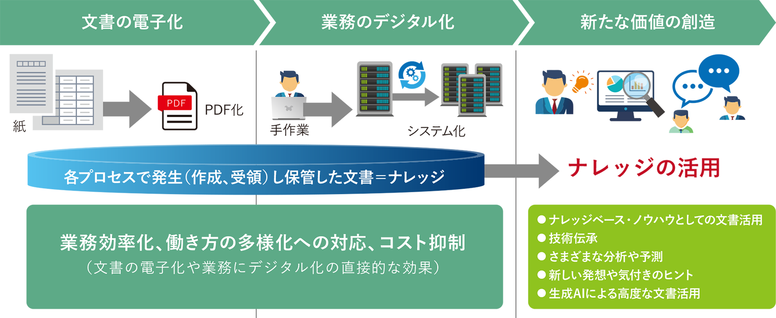 ペーパーレス化をDXの一環として考えた場合、書類の電子化とその保管は、DXの前提条件に過ぎません。保管、つまり蓄積された「知の資産=ナレッジ」を活用し、そこから新たな価値を生み出すことがDXだからです。すでにペーパーレス化を行っている企業も、改めてそのやり方を見直すべき時期に来ていると言えそうです。