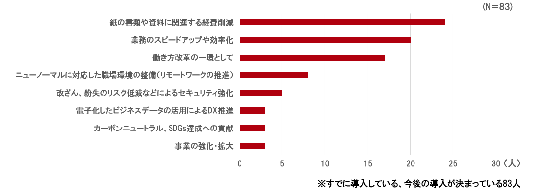ペーパーレスを導入した、または今後の導入を決定した目的や期待する効果として最も当てはまるものを聞いたところ、経費削減や業務のスピードアップや効率化、働き方改革の一環という回答に多く票が集まりました。そのほか、ニューノーマルに対応した職場環境の整備(リモートワーク推進)や改ざん、紛失のリスク低減などの回答もみられました。