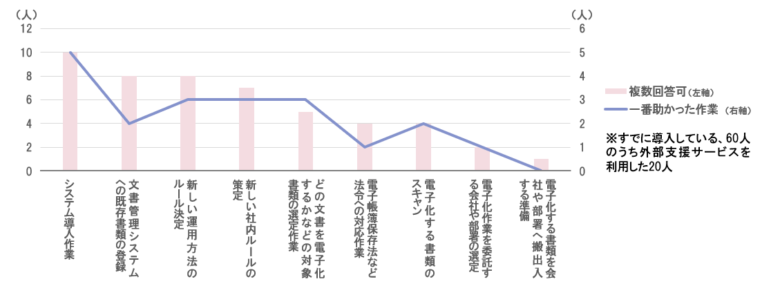 ペーパーレスを導入・推進するうえで、外部の支援サービスにお願いした作業を聞いたところ、システムの導入については多くの企業が外部支援サービスを利用していたことがわかりました。ほかにも、既存書類の登録や運用方法のルール決定、書類の選定など、さまざまな作業をお願いしているようです。