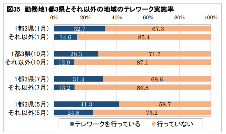 政府は出勤者の7割削減という指針を示しましたが、2021年2月現在、雇用者全体のテレワーク実施率は2割程度となっています(図34)。その中で、2度目の緊急事態宣言が出た都道府県のうちの1都3県(東京、神奈川、千葉、埼玉)は32.7%(それ以外の地域は14.6%)と、高い実施率にあることがわかります(図35)。これは前回の10月調査からの変化が少ないことから、緊急事態宣言への対応に加え、テレワークの実施が比較的進んでいる大企業が1都3県に多いことが要因と考えられます。