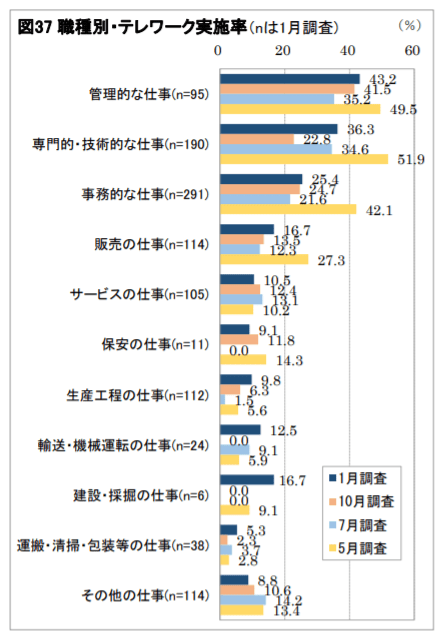 さらに、テレワークは「職種」によっても実施率に大きな差が見られます。実施率が高いのは「管理的な仕事」「専門的・技術的な仕事」「事務的な仕事」などで、一方、「運搬・清掃・包装等の仕事」「建設・採掘の仕事」「生産工程の仕事」などの職種では実施率が低くなっています(図37)。
