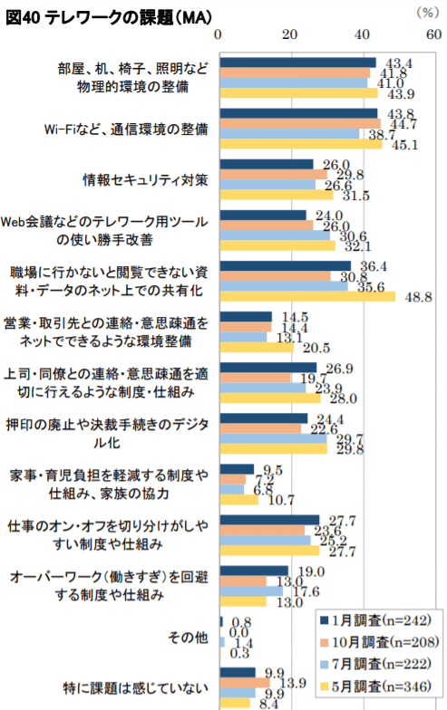 次にテレワークを実施している企業が感じている「課題」を見てみましょう。図40を見ると、「部屋、机、椅子、照明など物理的環境の整備」「Wi-Fiなど、通信環境の整備」「情報セキュリティ対策」「Web会議などのテレワーク用ツールの使い勝手改善」「職場に行かないと閲覧できない資料・データのネット上での共有化」など、テレワーク環境の設備に関する課題が多く挙げられています。テレワークを推進している企業でも、これらの課題をどのように解決していくかは今後のポイントになっていくでしょう。