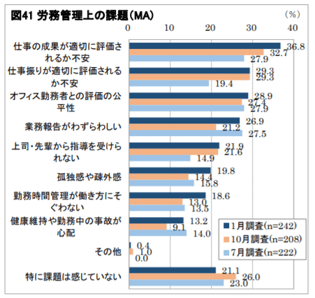 さらに企業は、「人事評価の課題」に向き合う必要にも迫られています。図41を見ると、労務管理上の課題として「オフィス勤務者との評価の公平性」「仕事の成果が適切に評価されるか不安」「仕事振りが適切に評価されるか不安」などの声が挙げられています。テレワークやオフィスワークという業務形態に関わらず、社員が安心して仕事ができるような人事評価の整備が、企業には求められているのです。