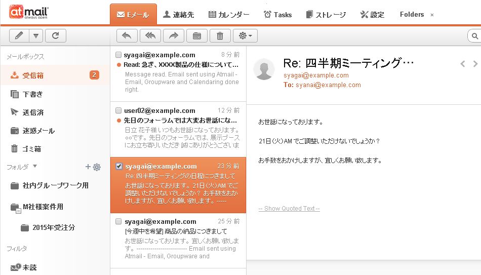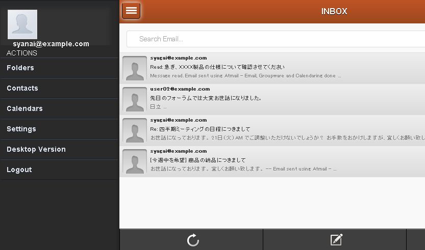 マルチデバイスに対応している次世代のWebメールソフトウェアです。 デバイスごとに使いやすいGUIを採用。 オプションとしてアドレス帳、カレンダー、ストレージを用意しています。 また、専用プラグインによりさまざまな機能拡張及およびカスタマイズが可能です。