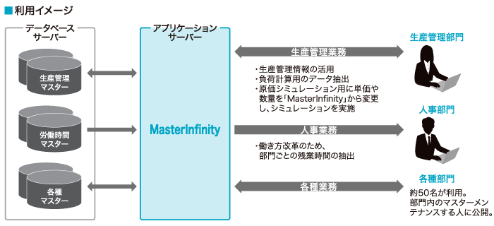例えば生産管理部門では、生産管理情報の活用、負荷計算のためのデータ抽出、原価管理シミュレーションにおける原価や数量などのデータ変更は「MasterInfinity」の画面を介して行っています。