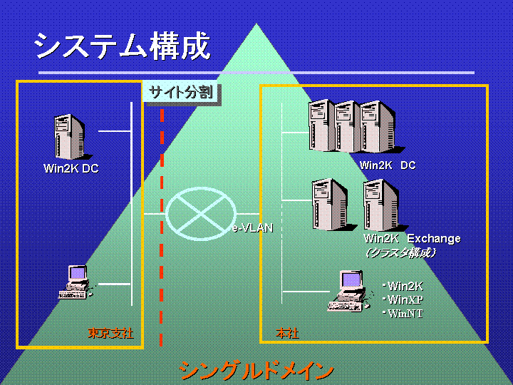 NTドメイン+ExchangeServer5.5で運用中。1台のPCを複数人で使用、1アカウントを複数人で使用している部分があり、各個人に必要な情報がタイムリーに伝達されないことやセキュリティ面においても不安材料がありました。また、システムの安定稼動を視野に入れたクラスタ構成も検討した結果、Windows NT環境をWindows 2000環境へ移行すると同時に情報インフラを見直しさらなる企業力の向上を目指して本プロジェクトが始まりました。
