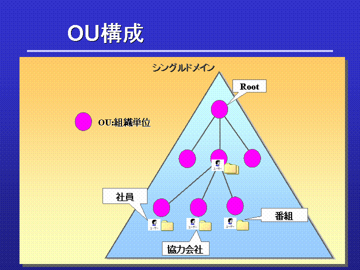 1人1アカウントになることで、ユーザ管理工数増大の可能性がありました。しかし、OU:組織単位で人事異動に関係しないユーザ格納構造を採用することで負荷を低減しました。