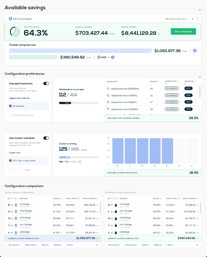 CAST AI エージェントは、お客様の設定を解析し、Cluster Savings Report を作成します。