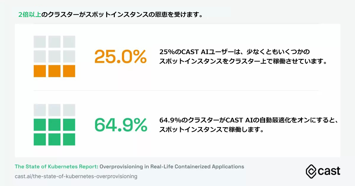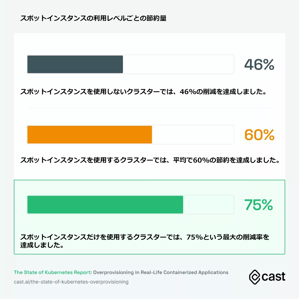 さらにスポットインスタンスも追加することで、組織はクラウド支出を平均60%削減できています。1