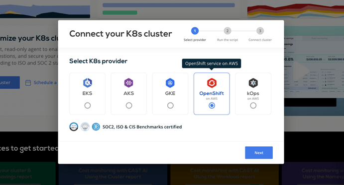 AWS上のRed Hat OpenShiftユーザーは、数分でクラスターをオンボードできます。CAST AIプラットフォームにサインアップし、読み取り専用モードでクラスターを接続します。CAST AIエージェントがクラスター構成を分析し、現在のコンピュートコストと、最適な構成でどれだけ節約できるかを表示します。
