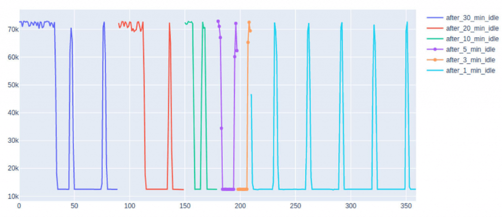このアプローチは、何か面白いことを発見するのに役立つことがあります。実際、次のようなことを見つけました。下のグラフは、AWS(t2.2xlarge、8仮想コア)のCPU動作を、数回のアイドル時間の後、さまざまな時間帯で示したものです。単一のクラウドプロバイダー内で、このような予測不可能なCPUの挙動を期待できるでしょうか?