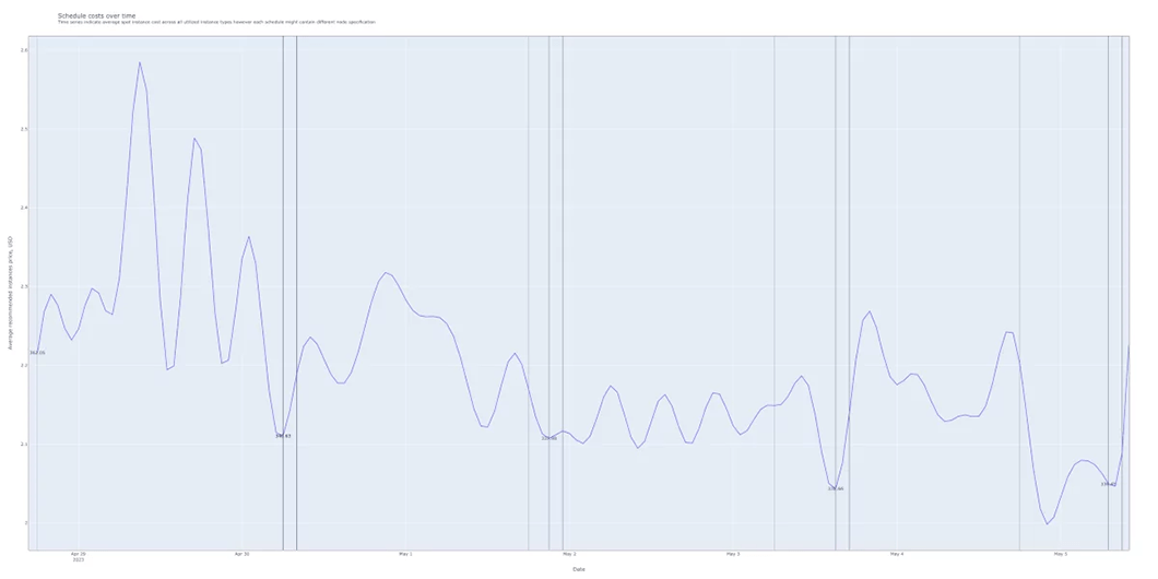 この簡易チャートでは、2つの異なるタイプのEC2インスタンスを使用して、単一のワークロードを実行した場合の価格が示されています。When-to-Runモデルにより、CPUやメモリーの要求量、将来の価格見通しなどの情報から、最適なポッド構成を算出しています。