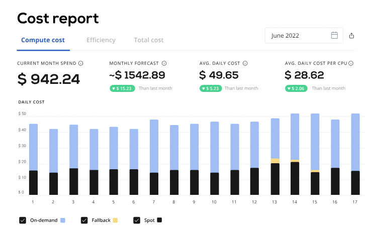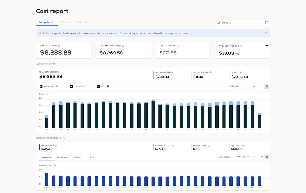 CAST AIのコスト監視モジュールは、クラウドの請求書をわかりやすくし、最も重要なクラウドコストのメトリックをすべて提供してコストの分析を迅速かつ簡単にします。