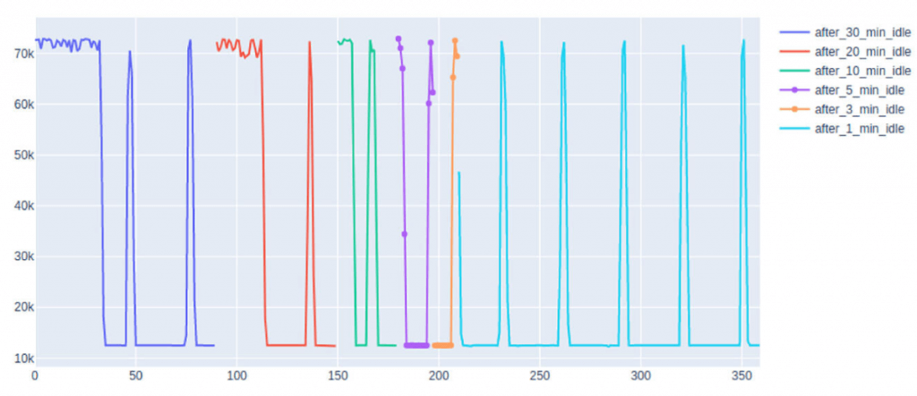 このアプローチによって、面白いことを発見するのに役立つことがあります。実際我々は次のようなことを見つけました。下のグラフは、AWS(t2.2xlarge、8仮想コア)のCPU動作を、数回のアイドル時間の後、さまざまな時間帯で示したものです。単一のクラウドプロバイダー内で、このような予測不可能なCPUの挙動を想像できるでしょうか?