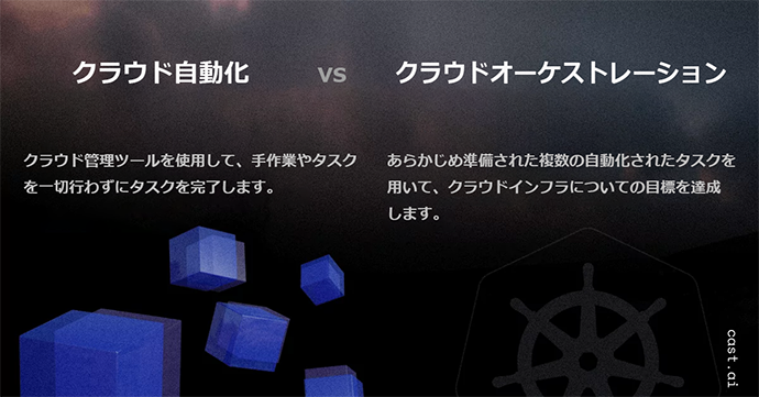 クラウド自動化は、自動化を目的としてデプロイメントタスクと管理タスクを定義しますが、クラウドオーケストレーションは、これら定義されたタスクを活用して目標に近づく戦略的アプローチです。