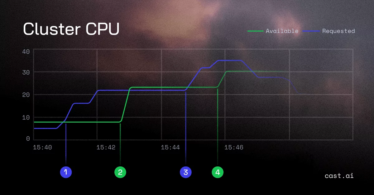 15:41に、アプリケーションでトラフィックの急増が発生し始めます。ツールはそれに対応するための新しいポッドを作成しますが、実行する場所がありません。新しいCPUコアが必要です。