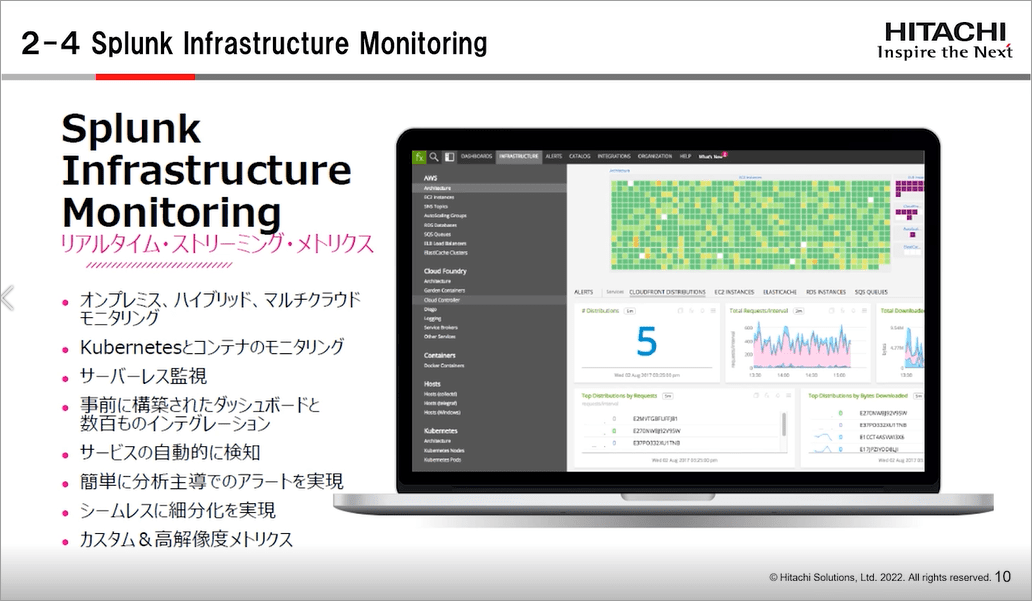 「Splunk Infrastructure Monitoring」は、オンプレミス環境やハイブリッド環境、マルチクラウド環境に対応。ハイブリッドにモニタリングでき、拡張性に優れたAIドリブンのリアルタイムインフラ監視ソリューションです。あらゆる規模、あらゆる導入形態のインフラを監視できます。「Splunk APM」はアプリケーションの状況確認や、問題発生時に、簡単にトラブルシューティングするための機能を提供するソリューションです。「Splunk RUM」はリアルタイムでユーザーの接続情報を確認することで、問題が起きているかを確認できる製品です。「Splunk APM」と組み合わせることで、ユーザーの操作から、サーバーでの情報を可視化する、高精度な監視ソリューションの実現も可能です。