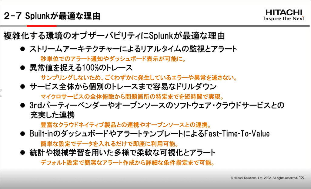 また、Splunkがなぜ最適なのかについて「ストリームアーキテクチャーによるリアルタイムの監視とアラート」「異常値を捉える100%のトレース」「サービス全体から個別のトレースまで容易なドリルダウン」「3rdパーティーベンダーやオープンソースのソフトウェア・クラウドサービスとの充実した連携」「Built-inのダッシュボードやアラートテンプレートによるFast-Time-To-Value」「統計や機械学習を用いた多様で柔軟な可視化とアラート」などの理由が述べられました。