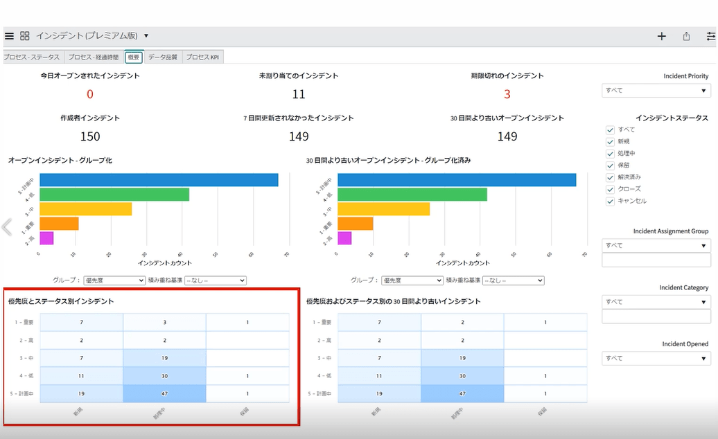 インシデントの「分析・活用」について、お客様から分析ができていないという悩みが多く、発生事象の対策に追われて振り返る余裕がない場合や、分析の方法が分からない場合があります。ServiceNowでは数々のレポートおよびダッシュボードがあり、さまざまな観点での状況把握を実現できます。時系列でKPIの達成状況を確認でき、どの分類のインシデントが増加傾向かといった、未来予測も可能です。