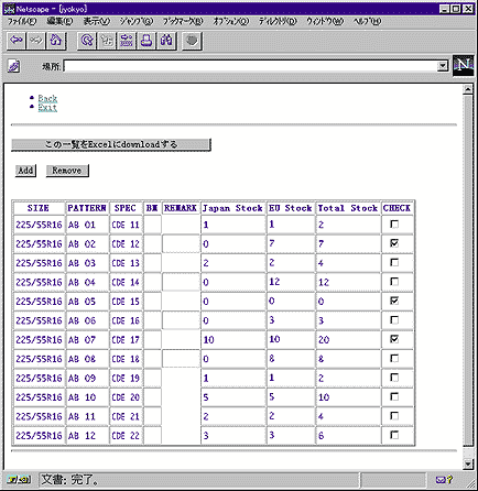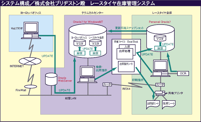 導入は、F1参戦に伴う従来システムの問題(処理速度、業務の重複)解決、さらには社内における情報インフラの実現、パソコン一人一台環境の整備…という、いくつかの要素が重なった恰好のタイミングで行われました。管理するデータは、国内外のすべてのレースタイヤ。カテゴリー、サイズ、種類などを網羅したデータベースを構築。システムは将来の拡張性を踏まえ、さらには、倉庫側で常に最新の在庫情報を保持したい、というお客様のご要望にお応えし、データベースの二重化を実施。テクニカルセンターにはメインとなるOracle7を、倉庫にサブとなるPersonal Oracle7を導入。新設のヨーロッパオフィスはインターネットで結び、3拠点の情報共有化を実現しました。また利用環境の面では、エンドユーザの操作性を重視。Oracleを意識することなく、Excelで操作できるようにしました。