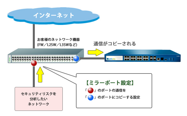 既存ネットワークの設計変更は必要ありません。「ミラーポート」を設定いただくだけです。