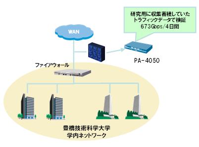 豊橋技術科学大学の学内のネットワークの最上段に設置したストレージに蓄積された大量の 実トラフィックデータを使って検証しました。 そのデータ量は4日間で673Gbpsに達しました。 実験の目的は、PAシリーズを使ってどの程度アプリケーションを識別できるか、 どの程度脅威を検知できるのかの検証をすることでした。 今回、大量の実トラフィックによる検証により識別や検知のさまざまな見え方のパターンを出すことができ、 精度の高い実証実験をすることができました。