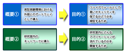- 実証実験のための外部とのゲートウェイとして導入し、ファイアウォールとしてのポテンシャルを計る